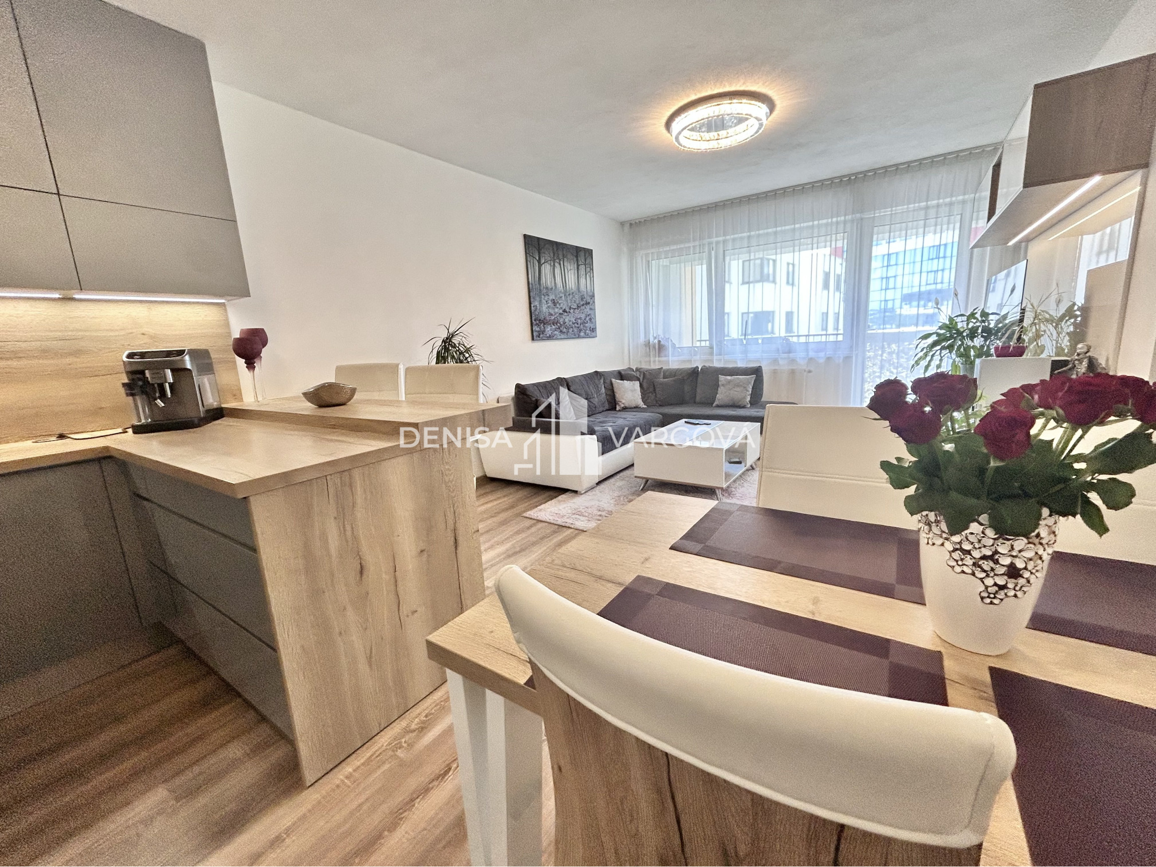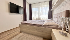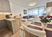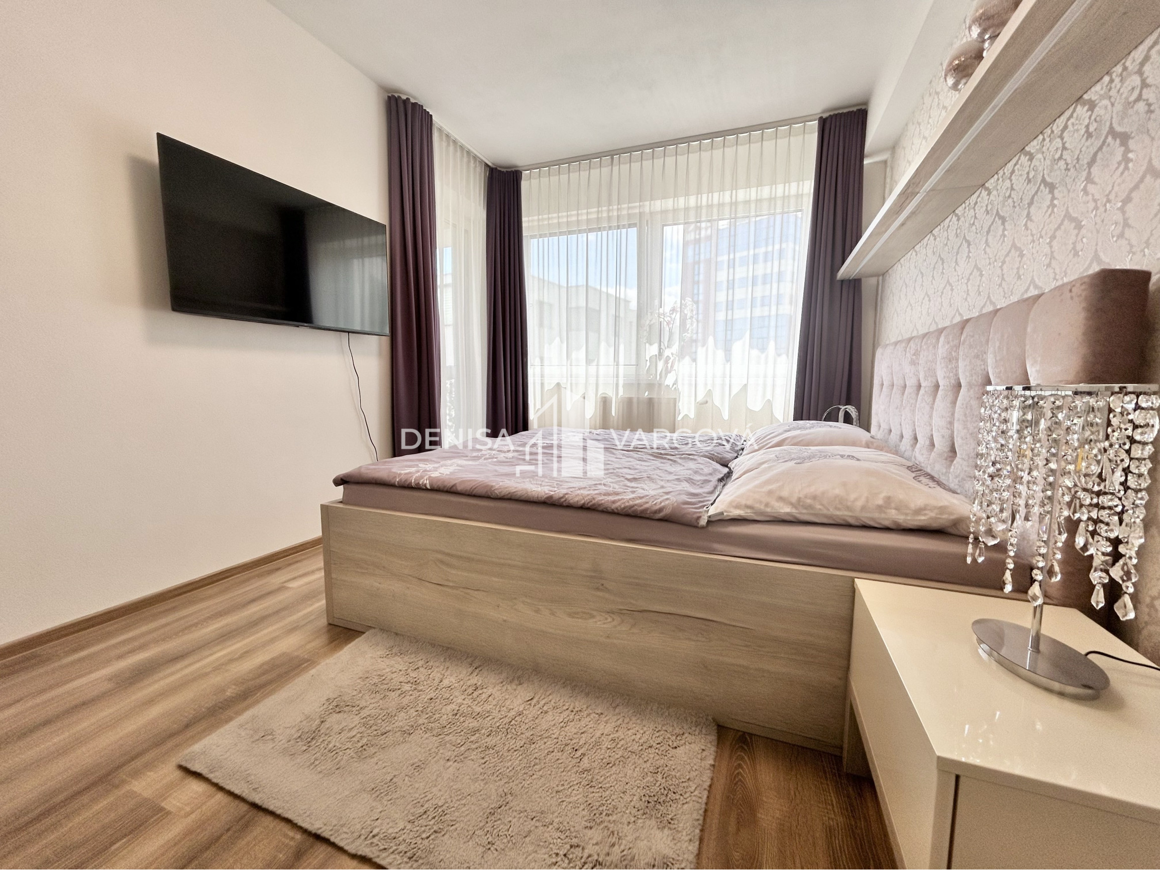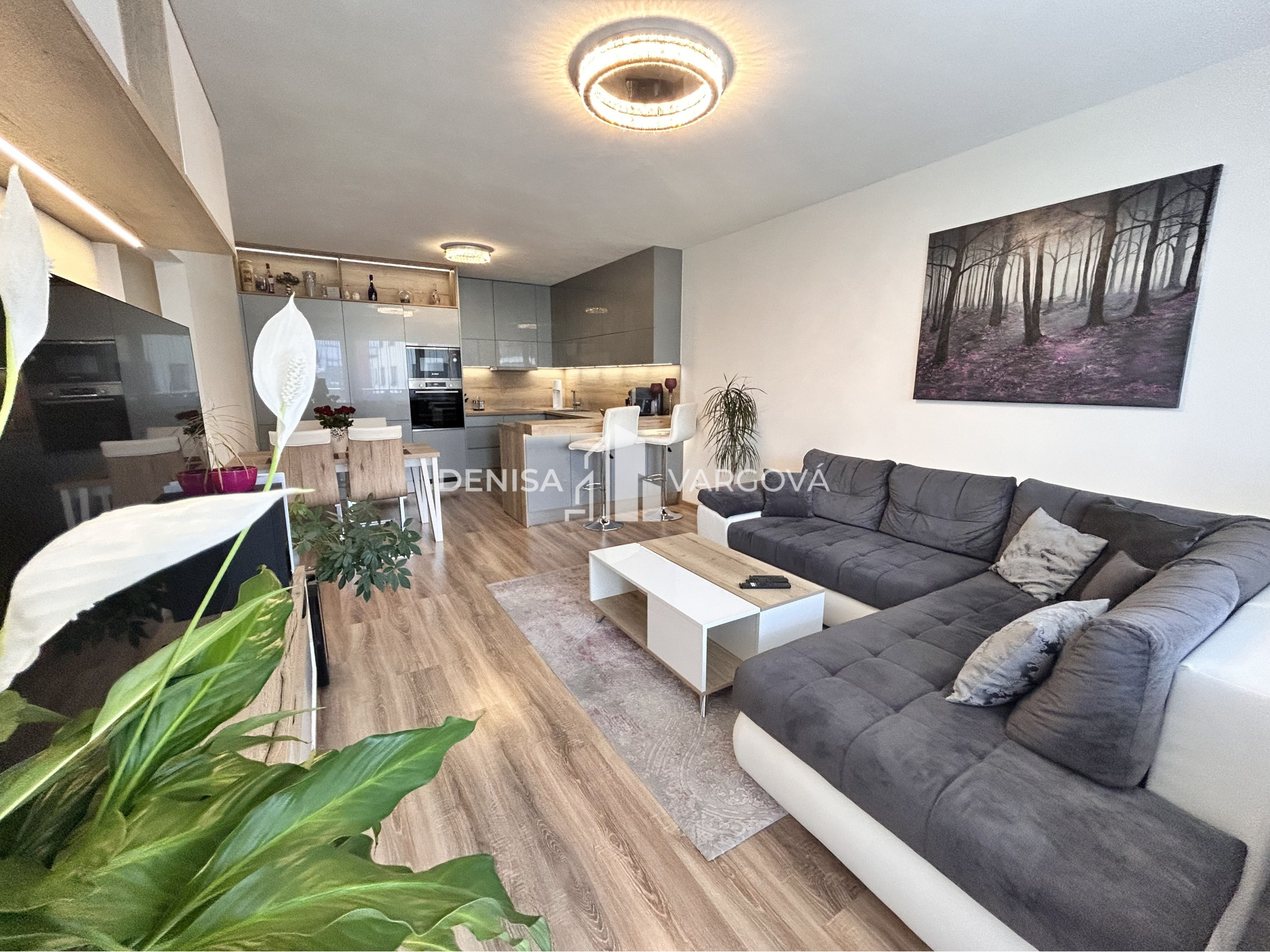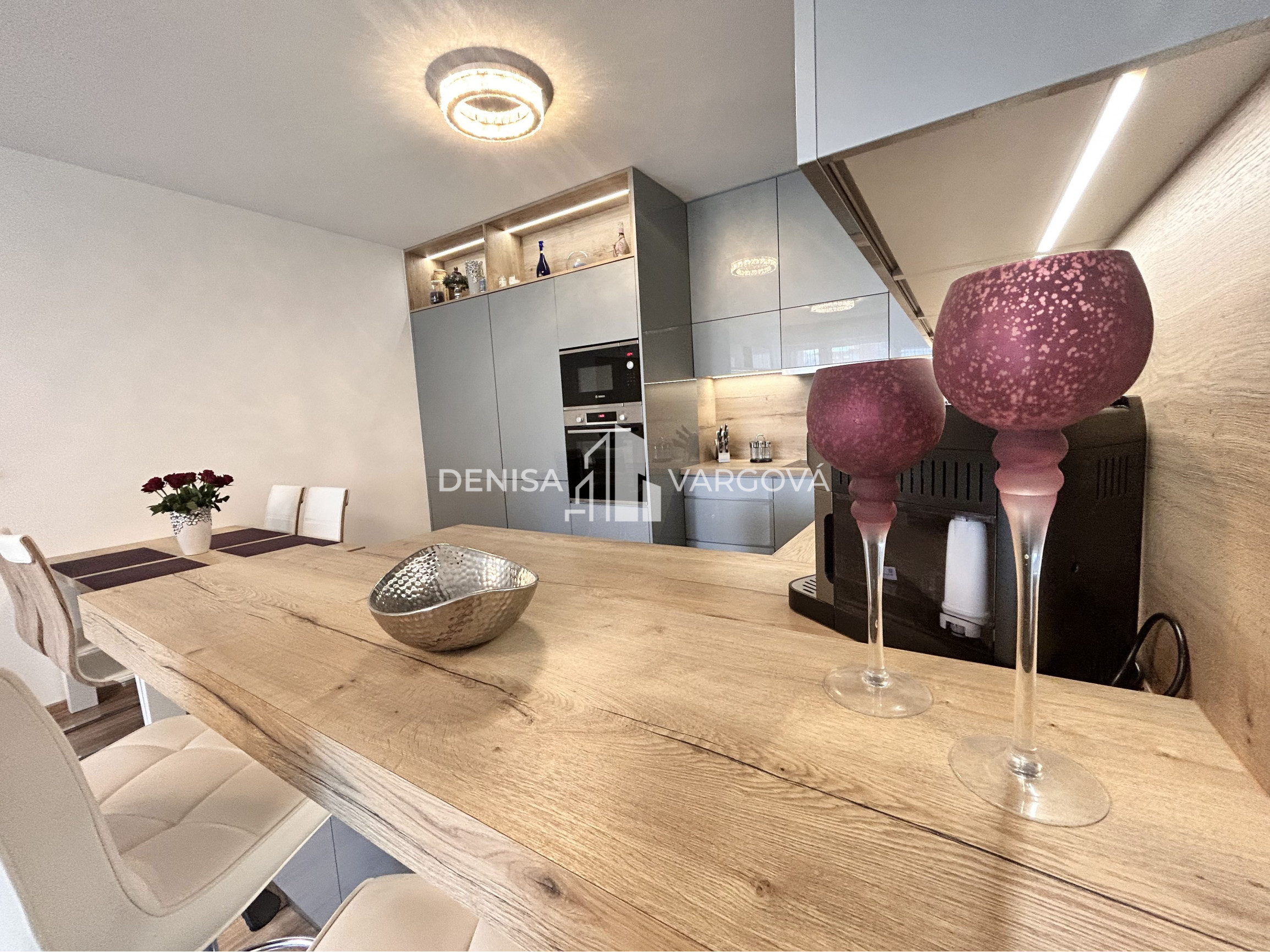 Byt je kompletne zariadený nábytkom na mieru, kuchynská linka je so zabudovanými spotrebičmi (chladnička s mrazničkou, elektrická rúra, mikrovlnná rúra, el. varná doska) a kuchynským vybavením, automatická práčka, sušička a komplet zariadenie je k dispozícii, ako je vidieť na fotodokumentácii.