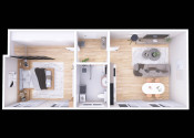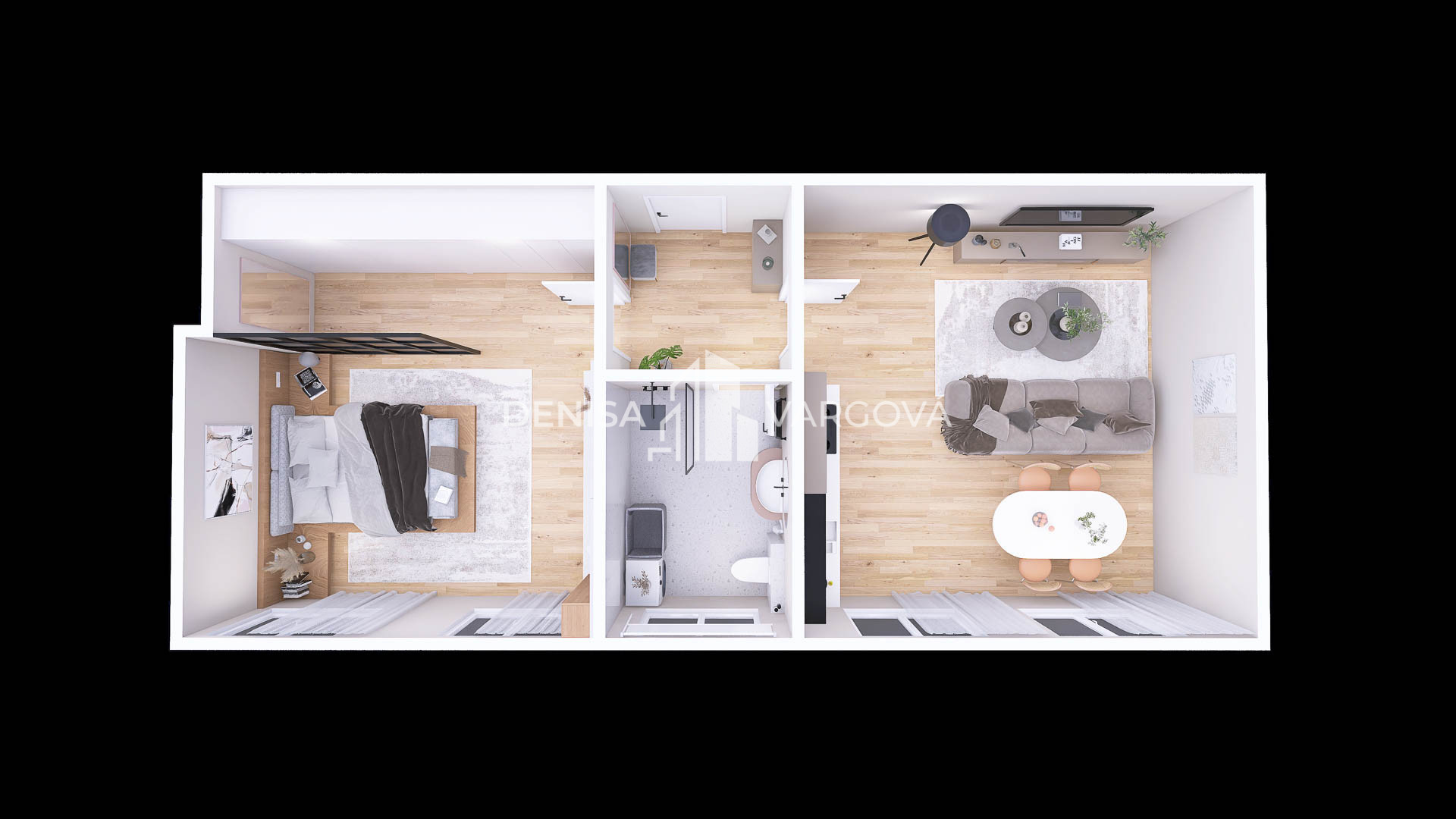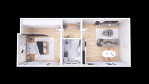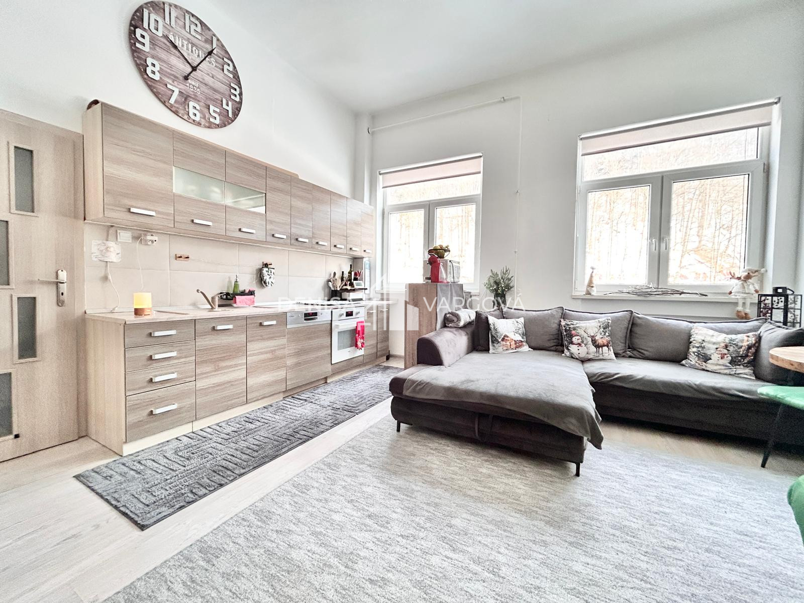Dispozícia: vstupná chodba, obývacia izba prepojená s kuchyňou, veľká samostatná priestranná izba, kúpeľňa s murovaným sprchovacím kútom spojená s WC.