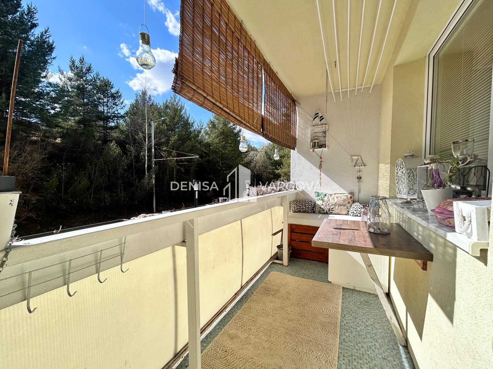 Byt pozostáva zo vstupnej chodby s komorou, priestrannej prechodnej izby s výstupom na veľkú loggiu, kde si môžete vychutnávať pokojné chvíle. Z tejto izby je vstup do kuchyne, dvoch samostatných izieb, murovanej kúpeľne a toalety.